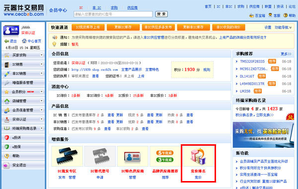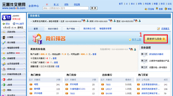 1、開通服務(wù)后,登錄會(huì)員中心,點(diǎn)擊首頁(yè)增值服務(wù)“競(jìng)價(jià)”(或左側(cè)菜單“增值服務(wù)管理”,點(diǎn)擊“我要競(jìng)價(jià)”)進(jìn)入競(jìng)價(jià)排名首頁(yè)。