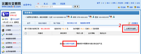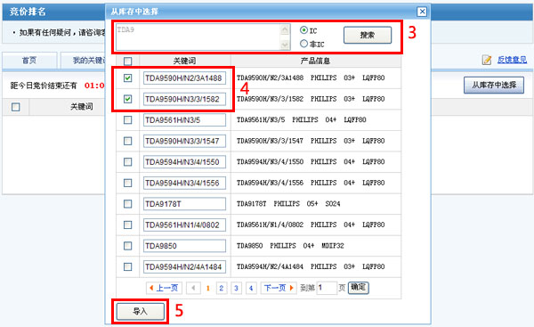 2、點(diǎn)擊“我要參與競(jìng)價(jià)”,從您發(fā)布的庫(kù)存中選擇要參與競(jìng)價(jià)的庫(kù)存,并設(shè)置關(guān)鍵詞,每次可以選擇多條,進(jìn)行批量競(jìng)價(jià)。