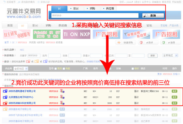 競(jìng)價(jià)排名是元器件交易網(wǎng)為通過實(shí)體認(rèn)證的會(huì)員全新打造的一款搜索結(jié)果排名服務(wù)。當(dāng)用戶搜索某產(chǎn)品關(guān)鍵詞時(shí),競(jìng)價(jià)成功此關(guān)鍵詞的企業(yè)將按照出價(jià)高低排在搜索結(jié)果的前三位。