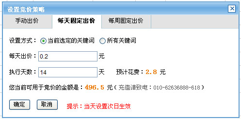 第三步:設(shè)置出價(jià)金額及執(zhí)行天(周)數(shù),點(diǎn)擊“確定”即可